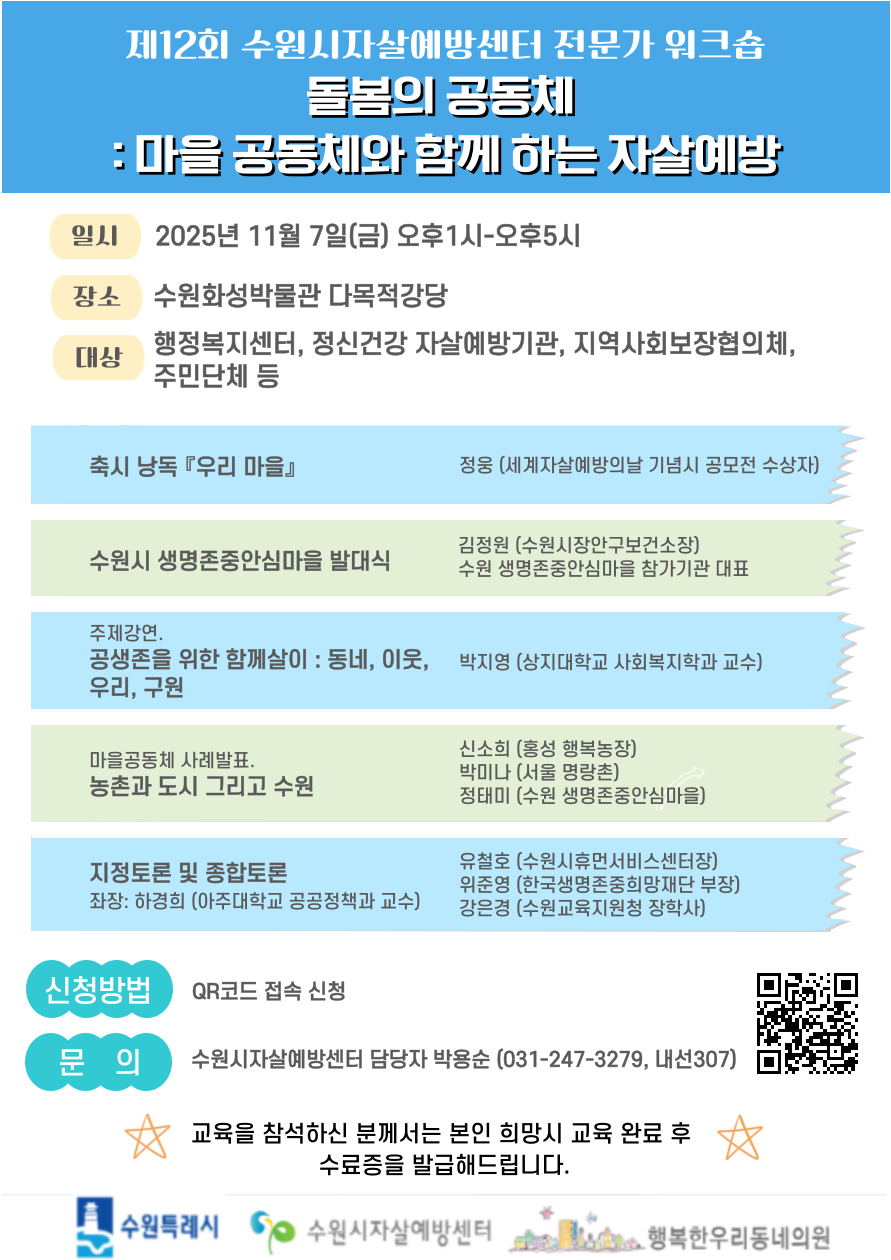 ¢º ÀϽà : 2025³â 11¿ù 7ÀÏ(±Ý) 13:00 ~ 17:00 ¢º Àå¼Ò : ¼ö¿øÈ¼º¹Ú¹°°ü ´Ù¸ñÀû°´ç ¢º ´ë »ó : Àڻ쿹¹æ ¹× Á¤½Å°Ç°º¹Áö¼¾ÅÍ, ÇàÁ¤º¹Áö¼¾ÅÍ, Áö¿ª»çȸº¸ÀåÇùÀÇü, ÁֹδÜü µî ¢º ÁÖ Á¦ : µ¹º½ÀÇ °øµ¿Ã¼ : ¸¶À»°øµ¿Ã¼¿Í ÇÔ²²ÇÏ´Â Àڻ쿹¹æ ¢º »çÀü½Åû±â°£ : 2025³â 10¿ù 13ÀÏ(¿ù) 9½Ã ~ 11¿ù 5ÀÏ(¼ö) 18½Ã ¢º ½Åû¹æ¹ý : QRÄÚµå Á¢¼Ó ½Åû (ȨÆäÀÌÁö - ÆË¾÷â - ¿öÅ©¼óÂü°¡½Åû¼(±¸±ÛÆû) ¢º Âü°¡ºñ : ¹«·á ¢º ¹® ÀÇ : ¼ö¿ø½ÃÀڻ쿹¹æ¼¾ÅÍ ´ã´çÀÚ ¹Ú¿ë¼ø (031-247-3279, ³»¼± 307) ¢º ÁÖ °ü : ¼ö¿øÆ¯·Ê½Ã ¢º ÁÖ ÃÖ : ¼ö¿ø½ÃÀڻ쿹¹æ¼¾ÅÍ ¢º Çù ·Â : ÇູÇѿ츮µ¿³×ÀÇ¿ø